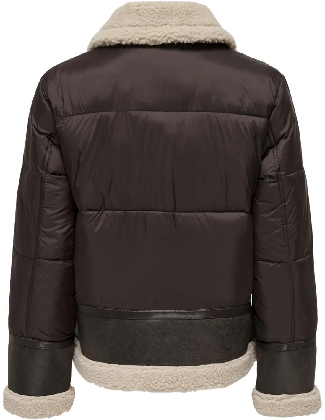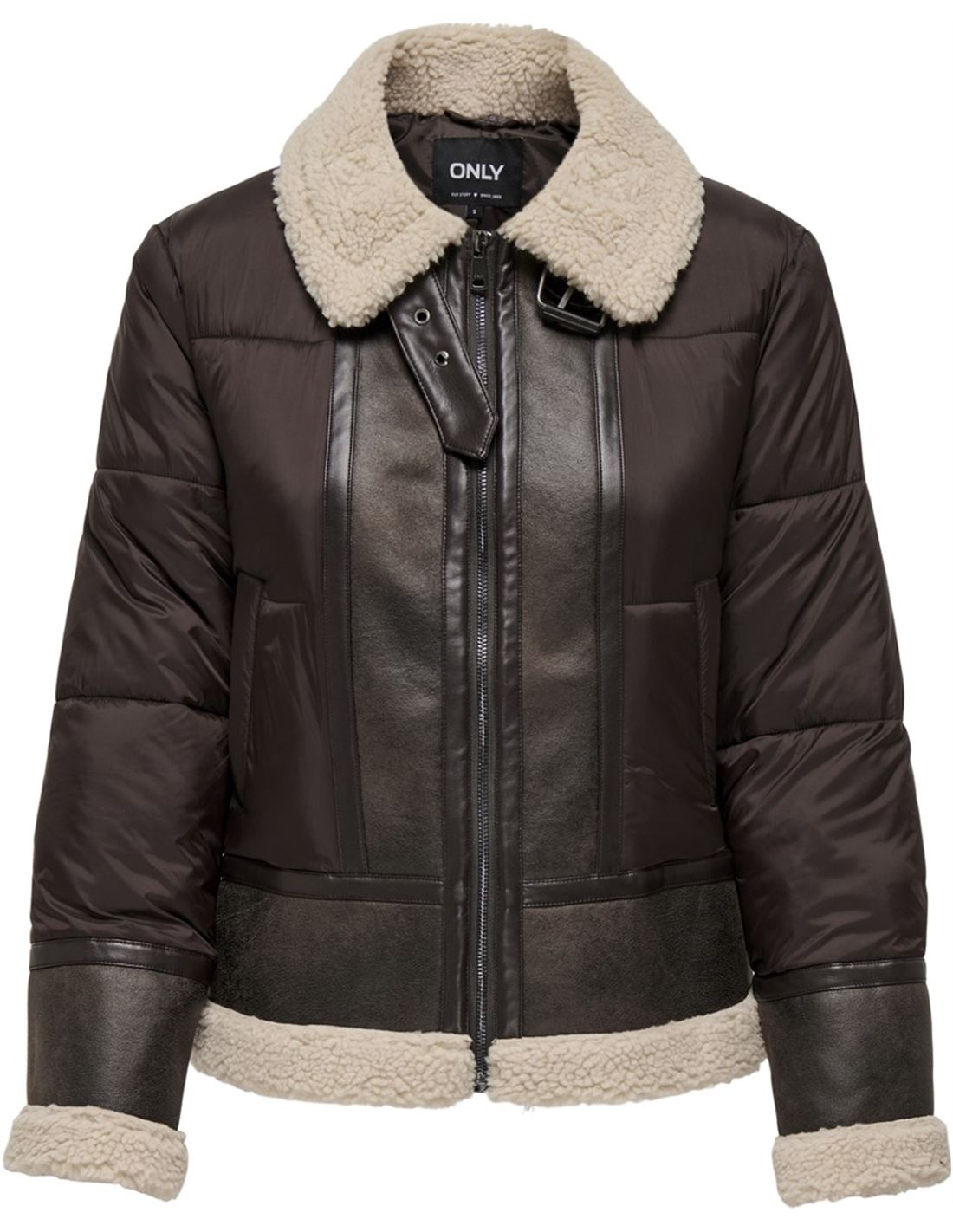Cazadora de mujer parte acolchada y parte piel sintética.