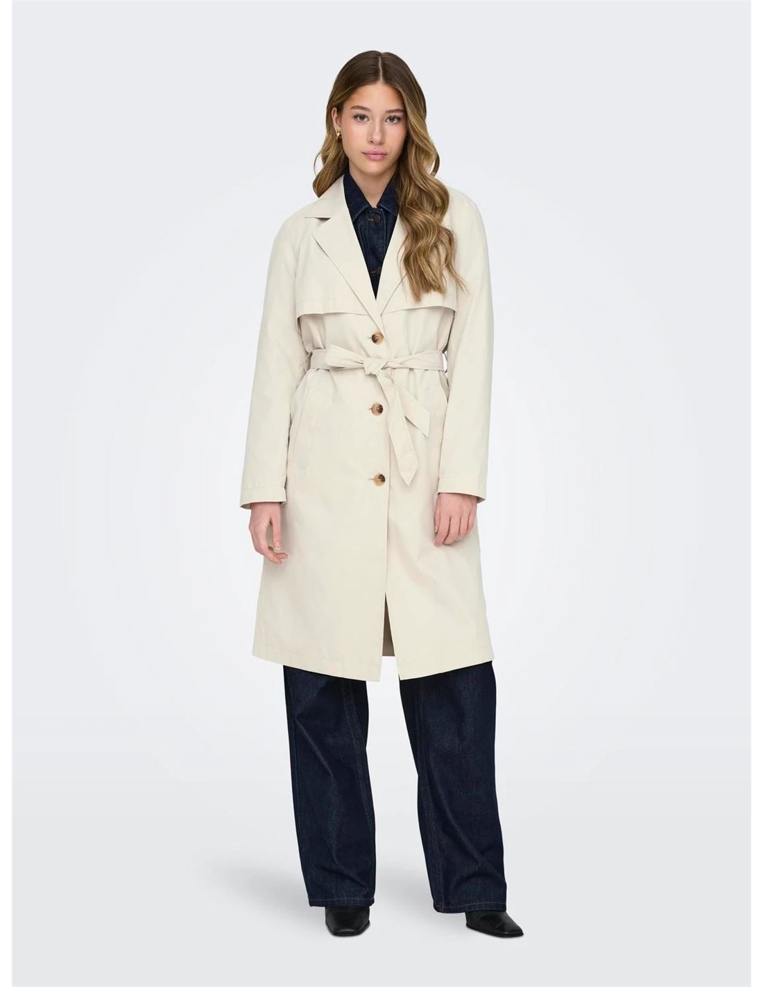 Gabardina de mujer con solapa. Cierre de botones y bolsillos laterales. Cinturón a nivel de la cintura.