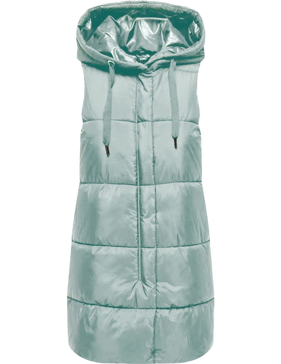 Chaleco sin mangas acolchado de mujer. Con capucha con cordón reguble y bolsillos laterales. Cierre con botones y cremallera. Forro de poliéster para una sensación de comodidad.