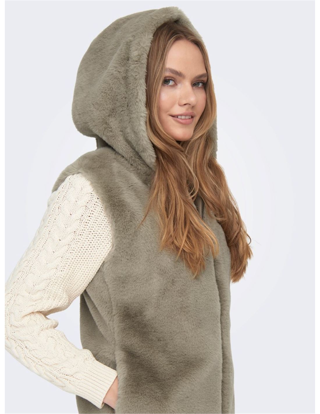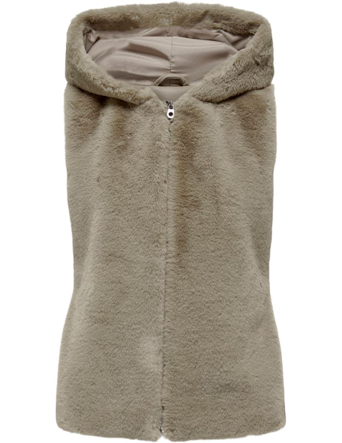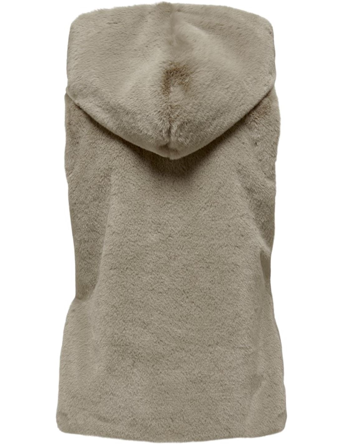 Chaleco de piel sintética sin mangas con capucha. Cierre de cremallera completa.