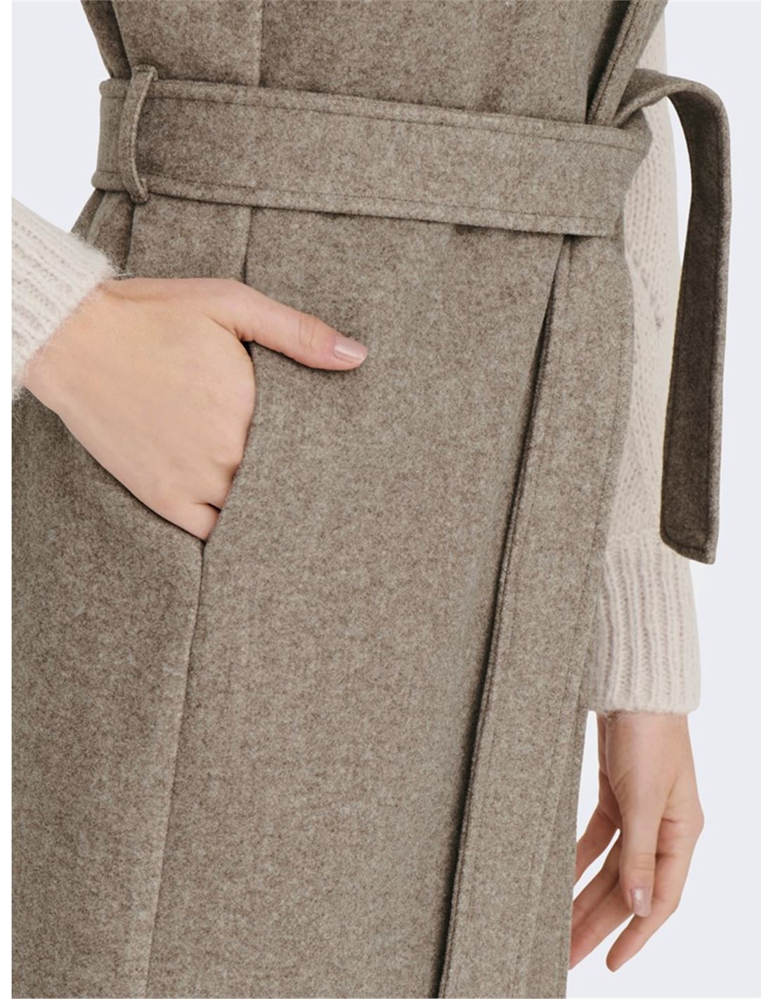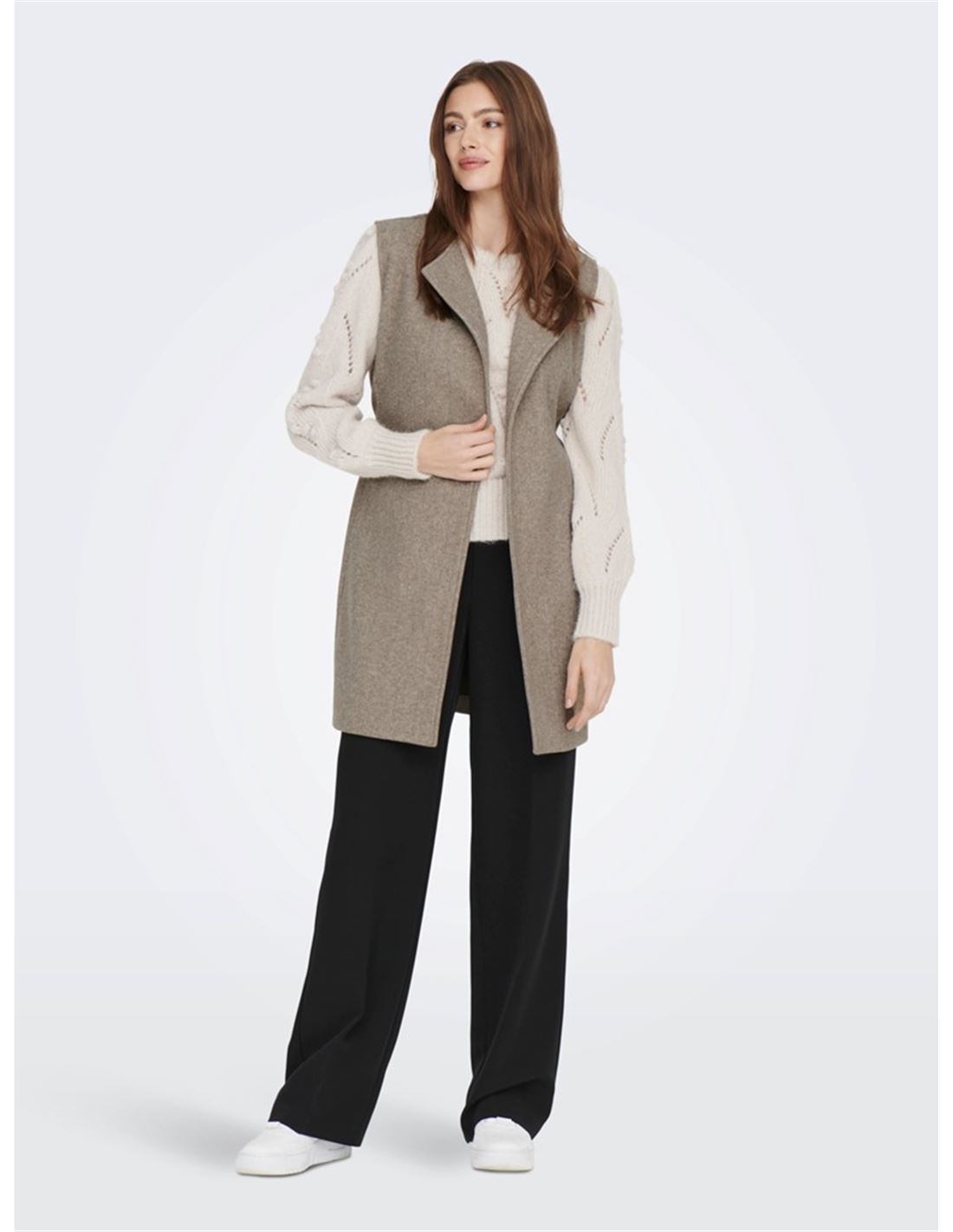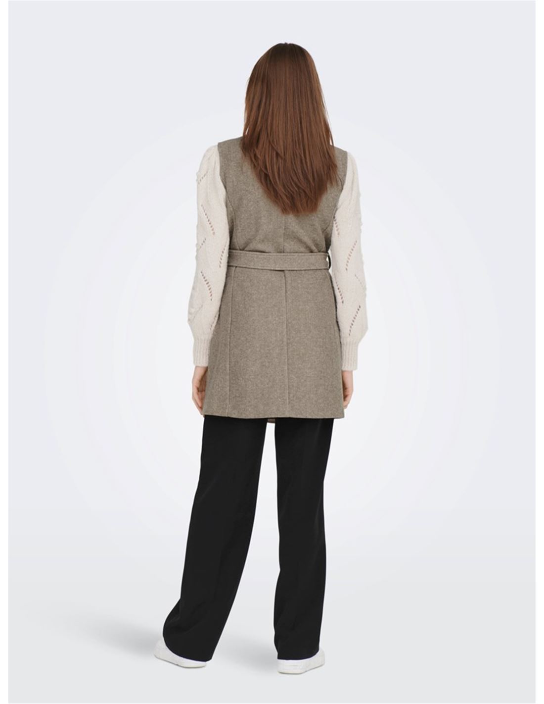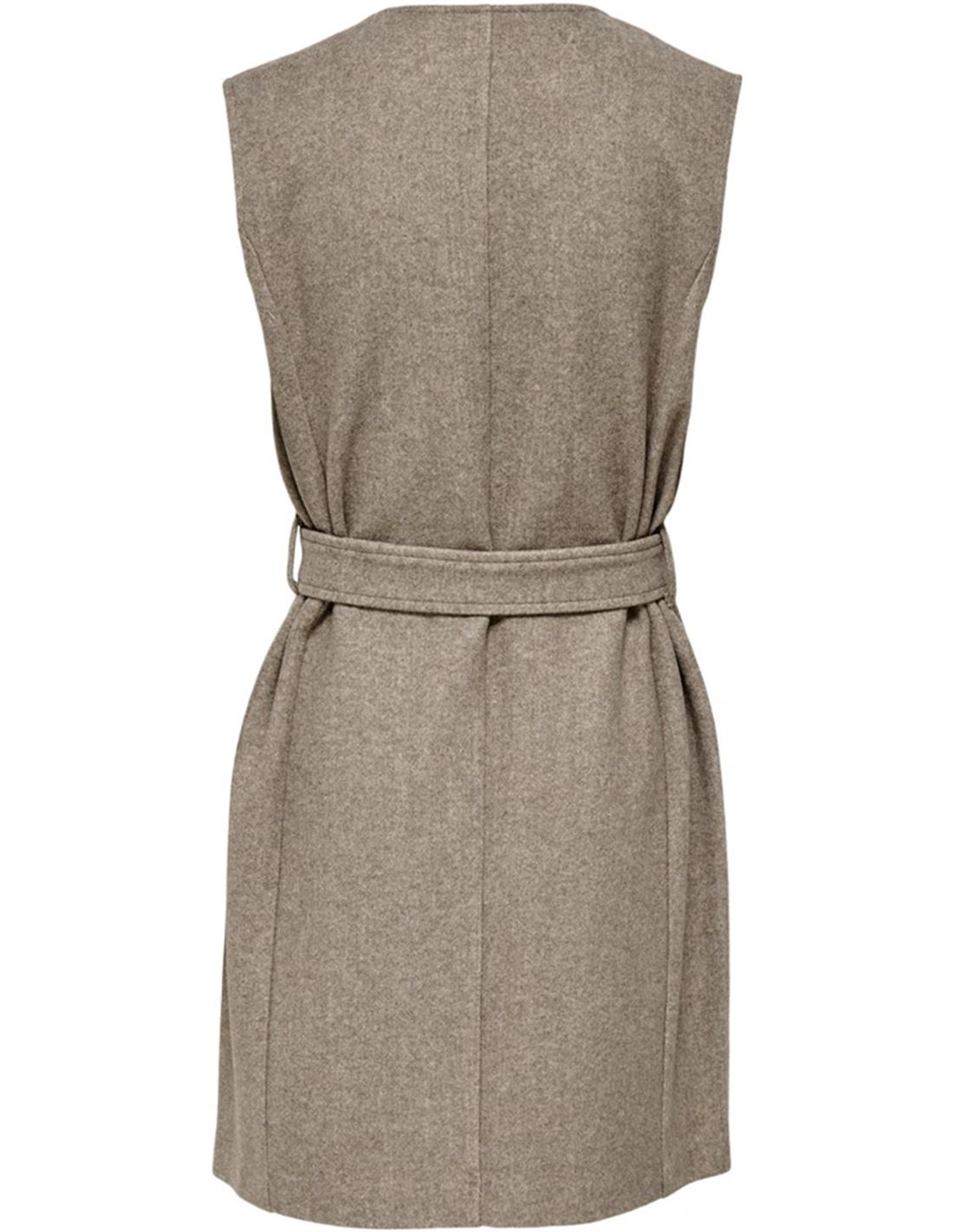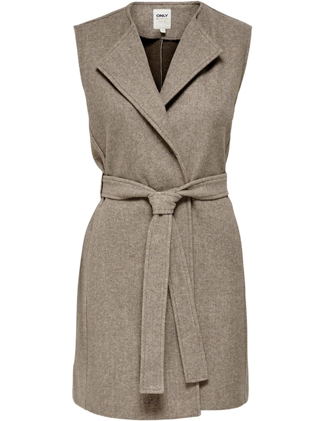 Chaleco de mujer sin mangas. Cuello de solapa y cierre con cinturón.