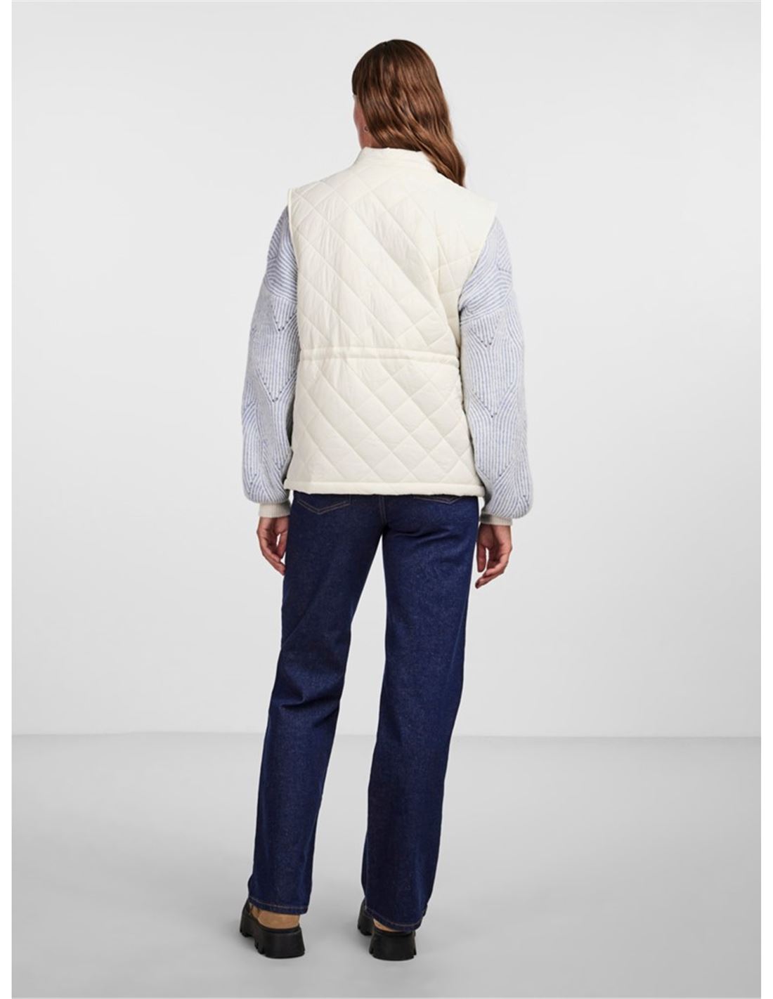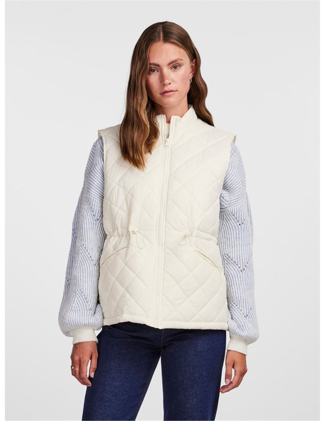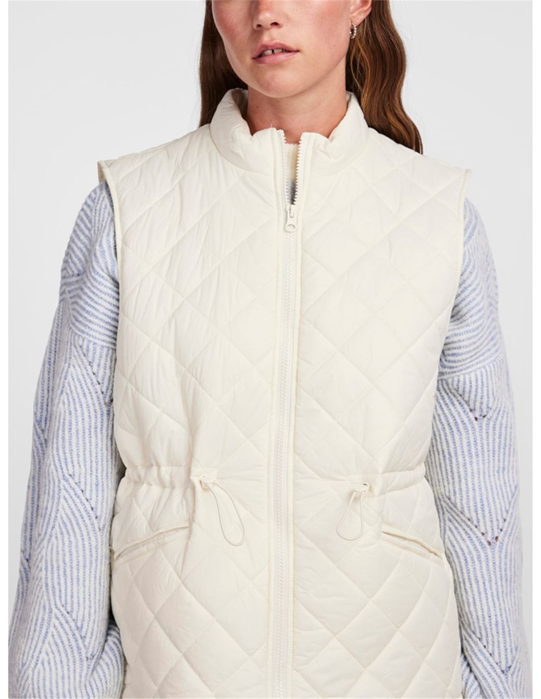 Chaleco de mujer acolchado de cuello redondo. Cierre con cremallera y bolsillos delanteros. Cordón en la cintura para entallar.