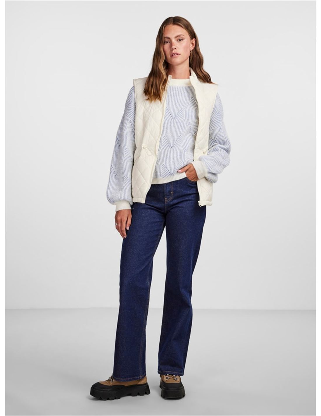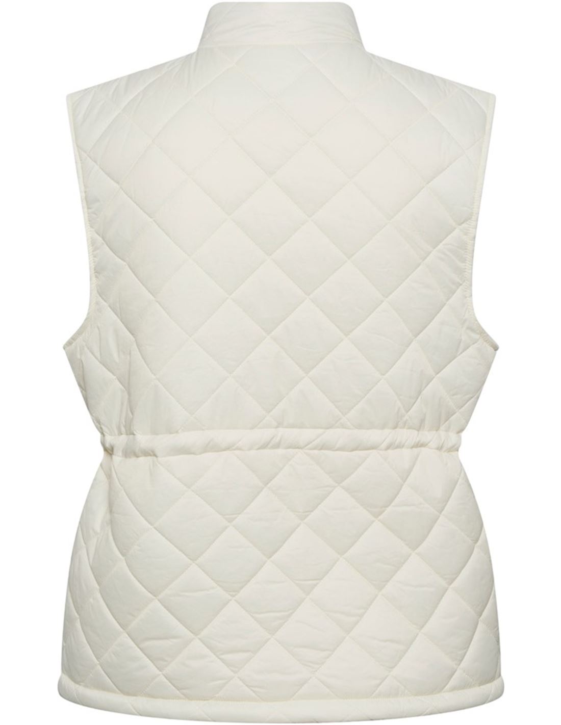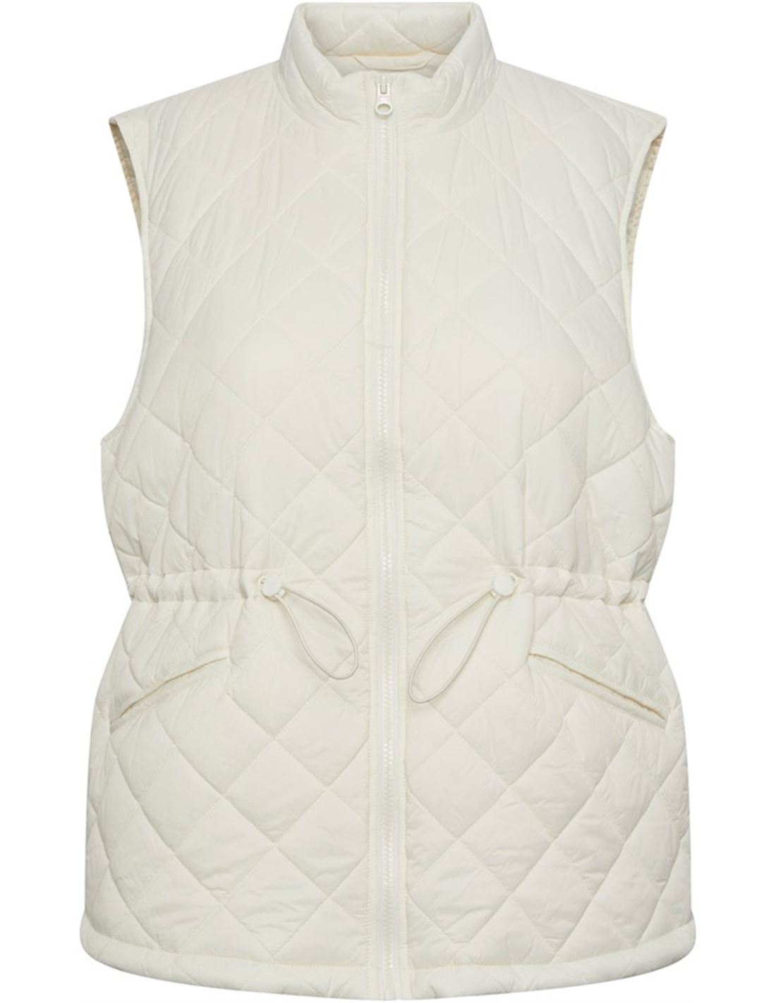 Chaleco de mujer acolchado de cuello redondo. Cierre con cremallera y bolsillos delanteros. Cordón en la cintura para entallar.