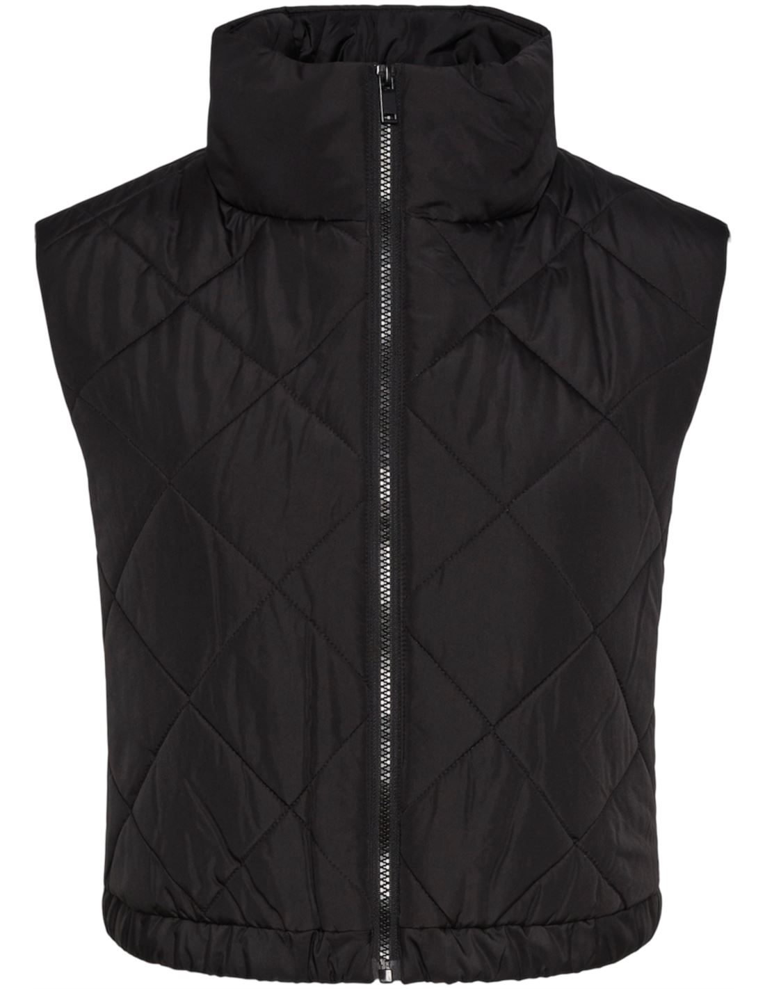 Chaleco corto de mujer sin mangas. Cuello subido y cierre de cremallera. Composición: 100% Poliéster - Reciclado