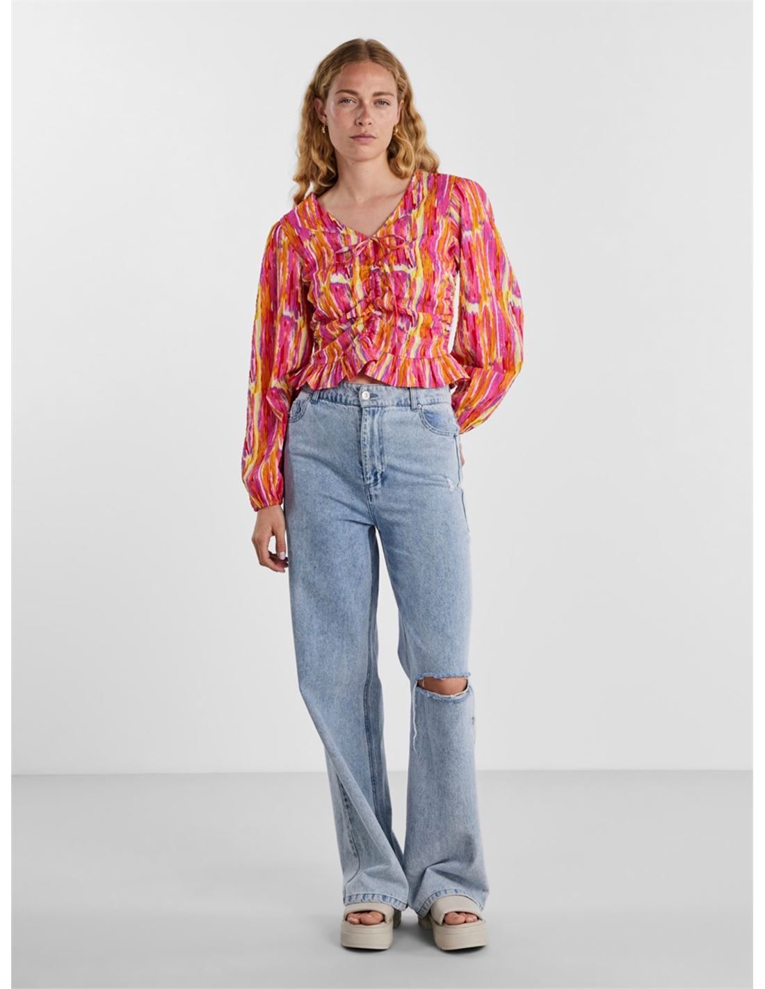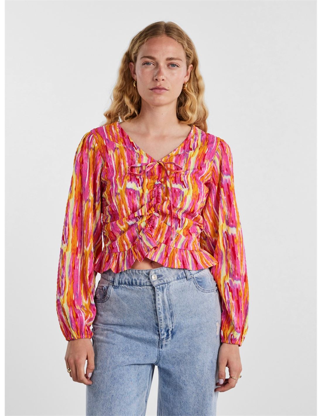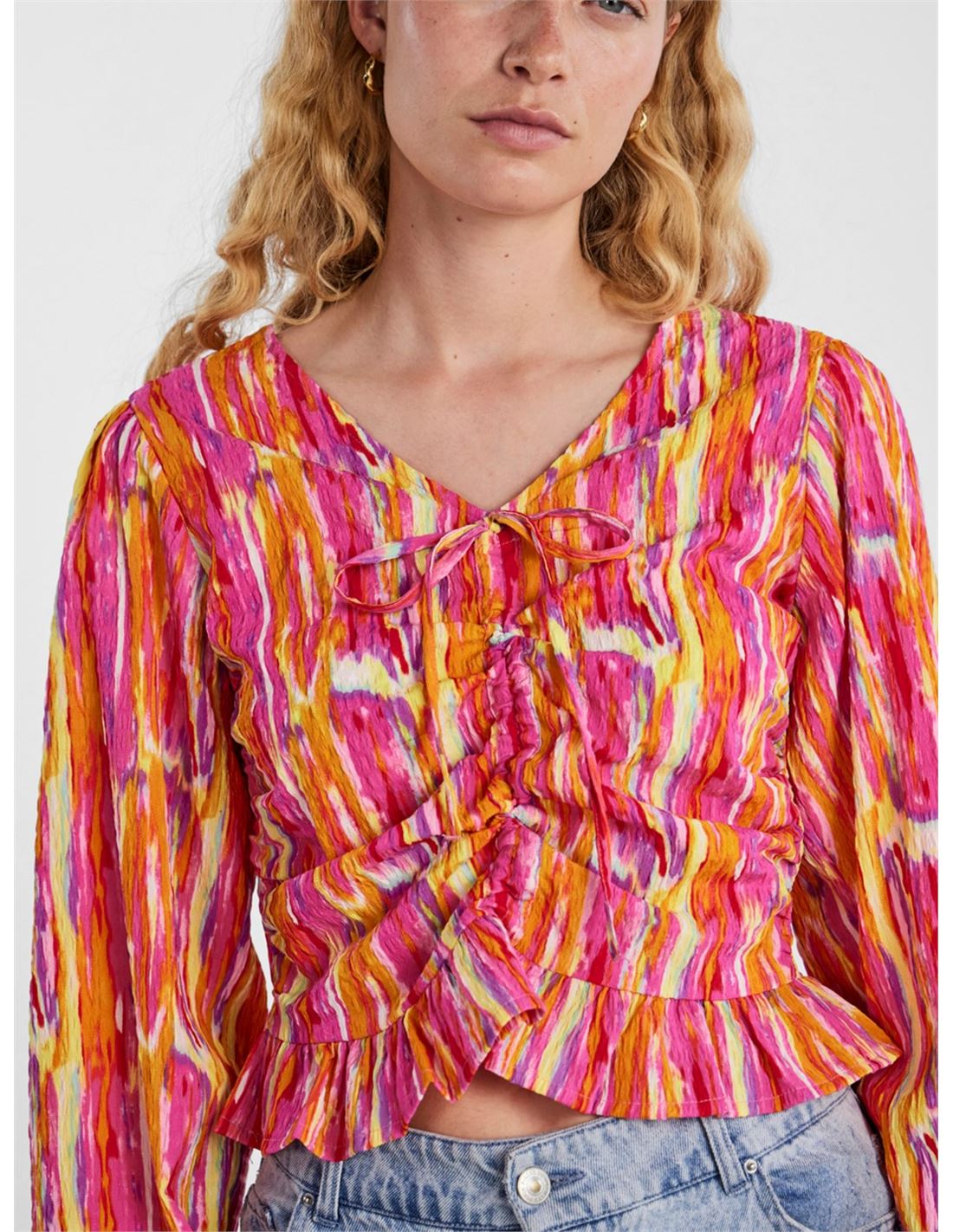 Camisa mujer estampada manga larga con fruncido en la parte delantera y lazo. Cuello pico.