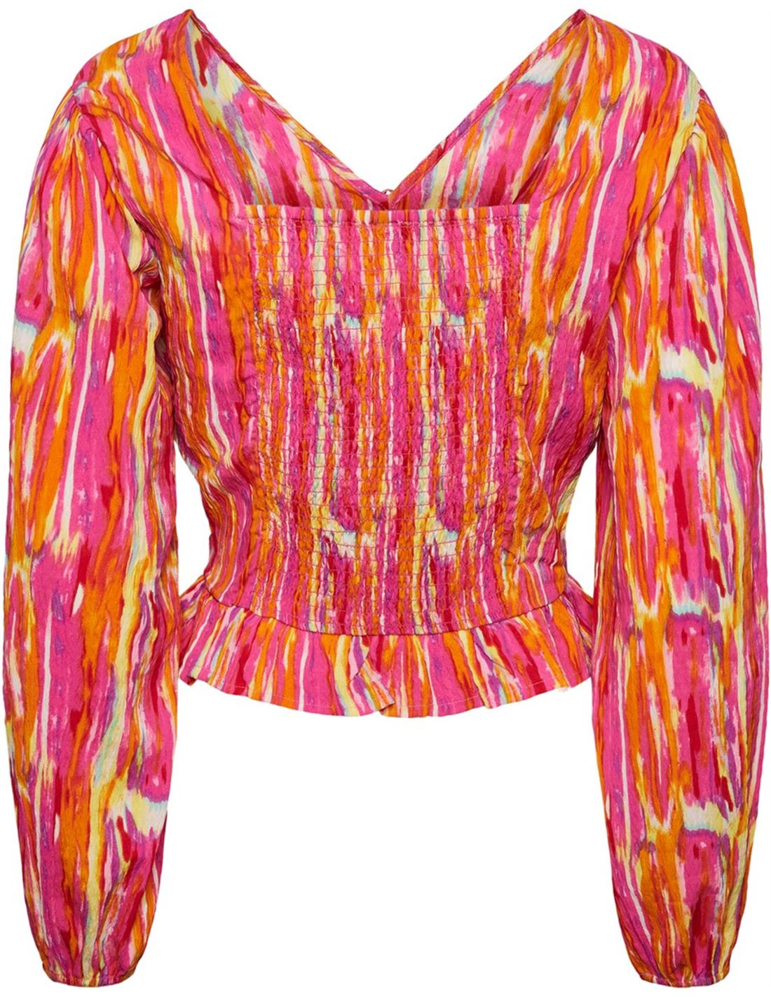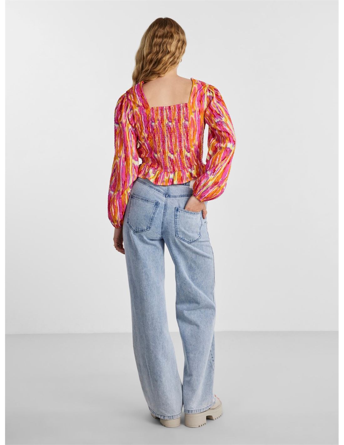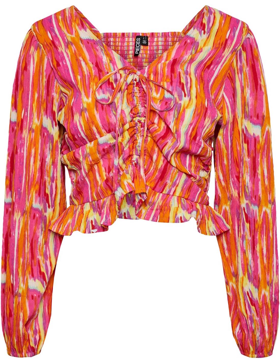 Camisa mujer estampada manga larga con fruncido en la parte delantera y lazo. Cuello pico.