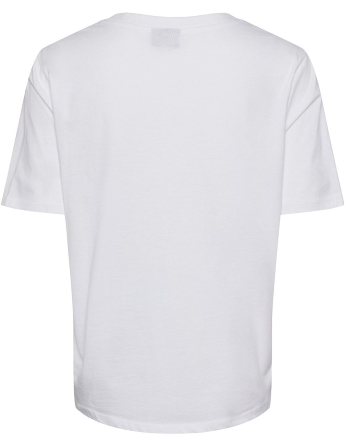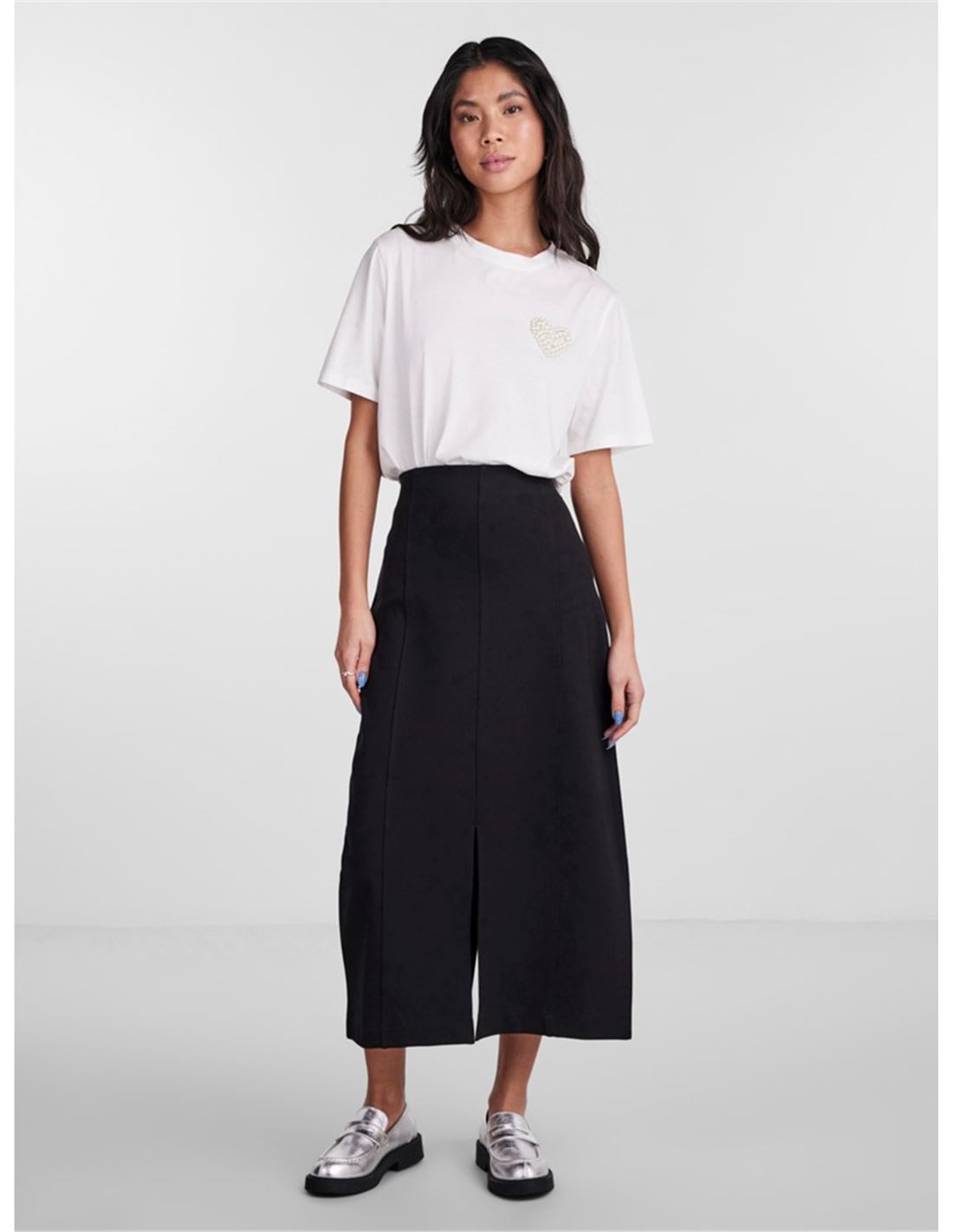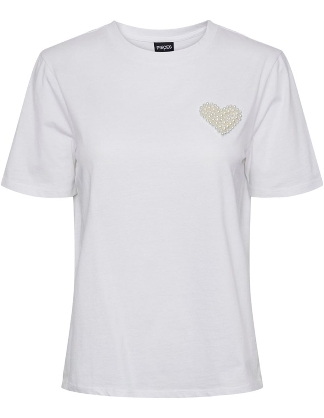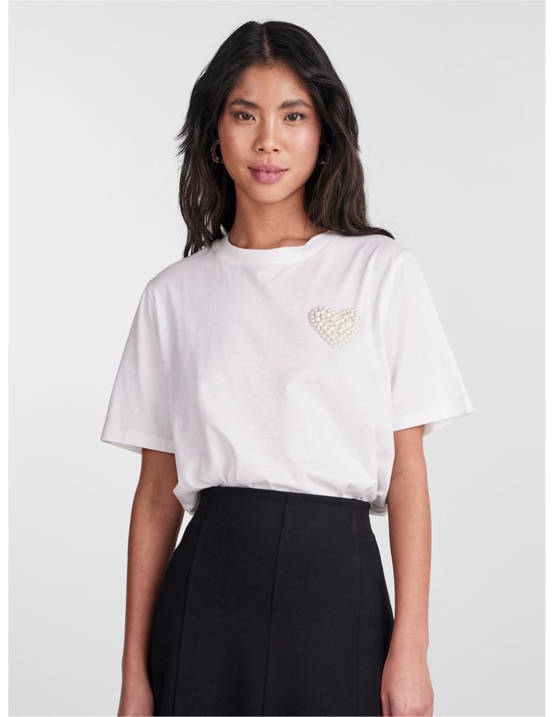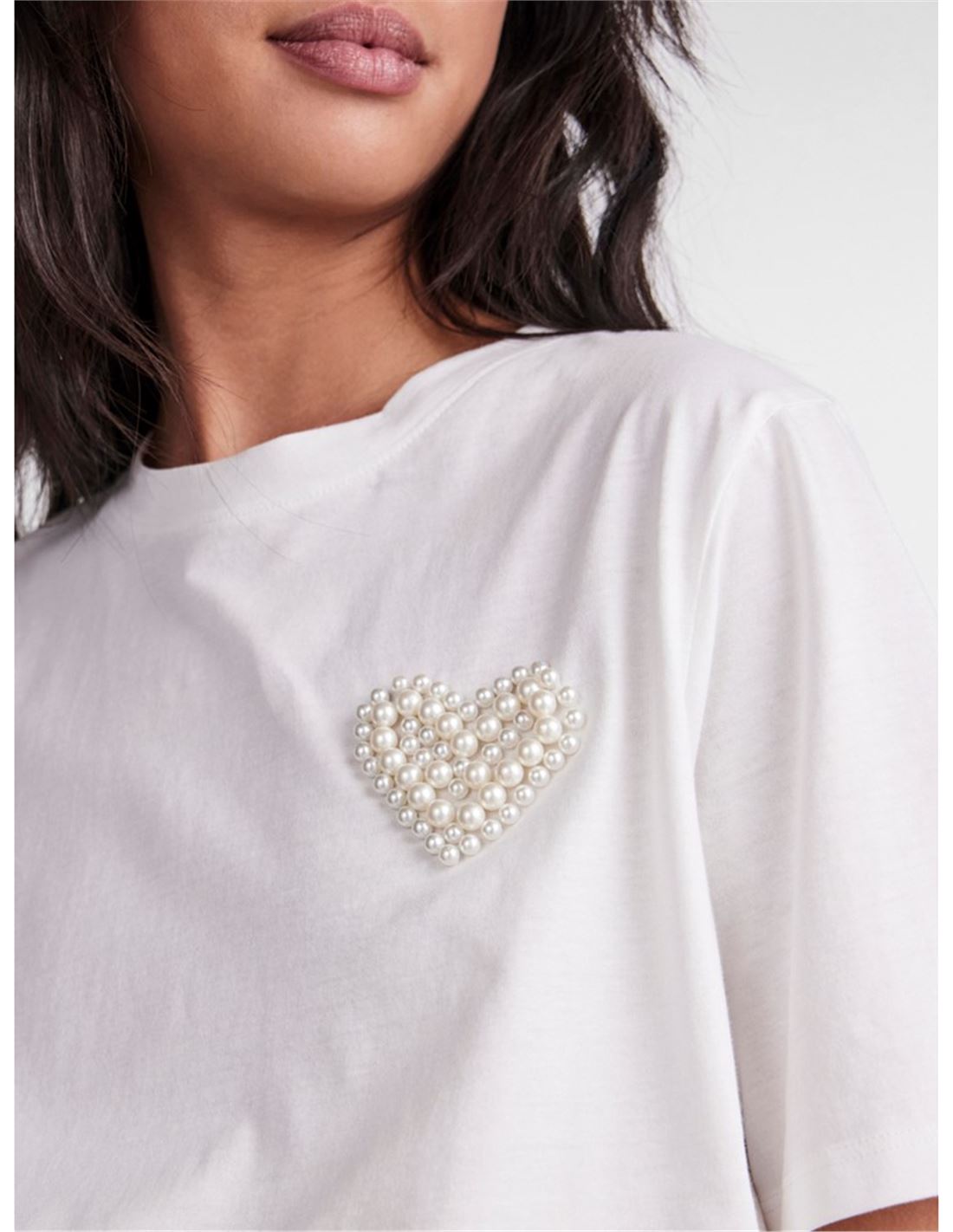 Camiseta de mujer de manga corta y cuello redondo. Detalle de corazón con perlas en el pecho.
