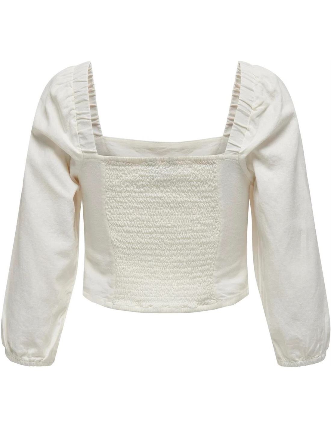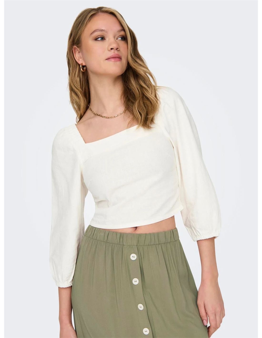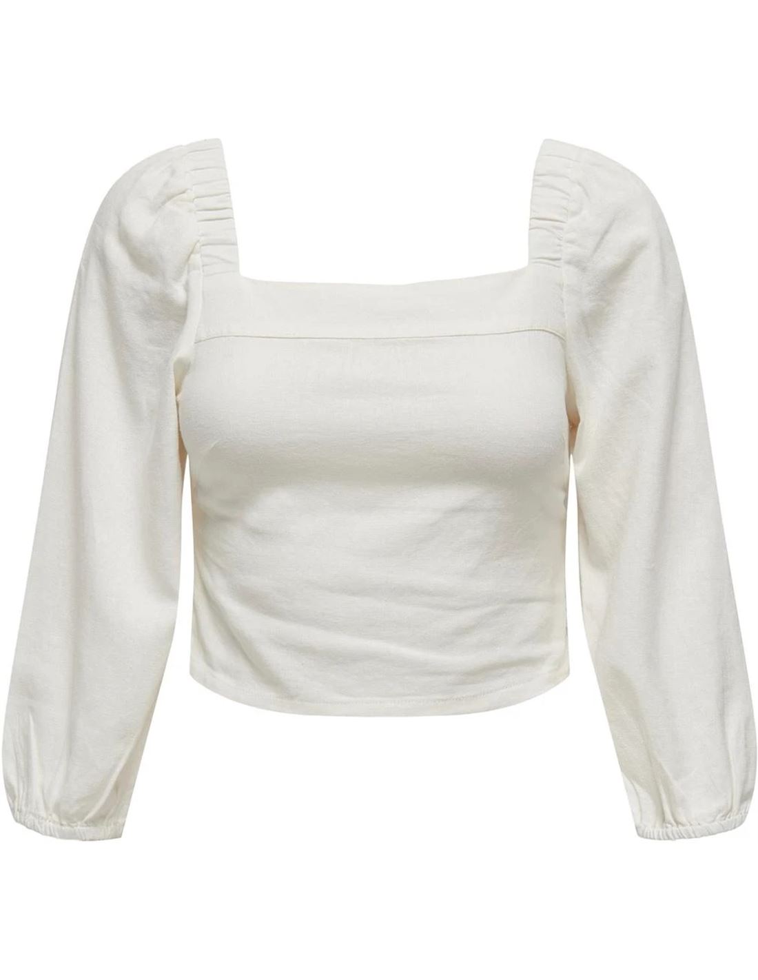 Top de lino de mujer con cuello cuadrado y mangas abullonadas. Puños elásticos. Detalle fruncido en la espalda.