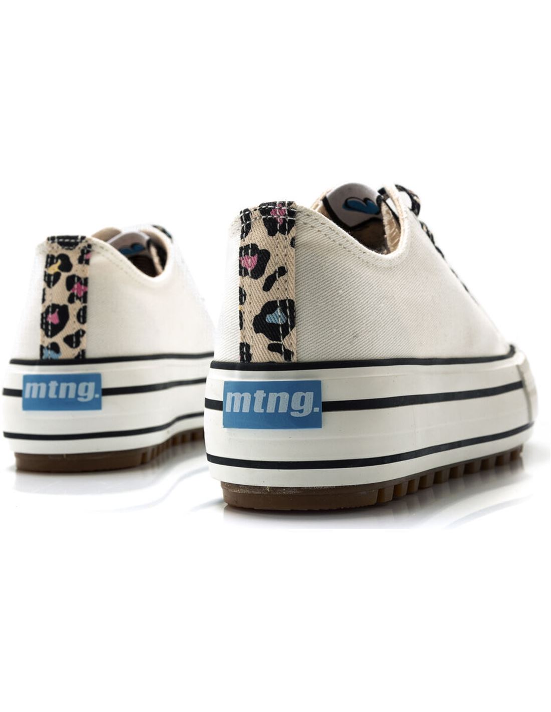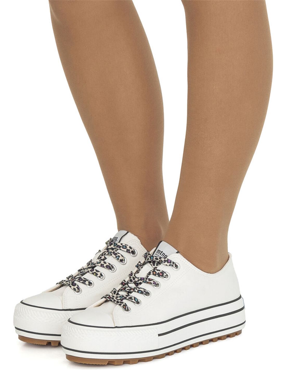 Zapatilla casual Bigger-t Mustang para mujer. Diseñadas en color blanco, incorporan un estampado de leopardo multicolor en los cordones y en una divertida tira trasera. Doble suela estilo chunky. Cierre de cordones planos. Puntera redondeada.