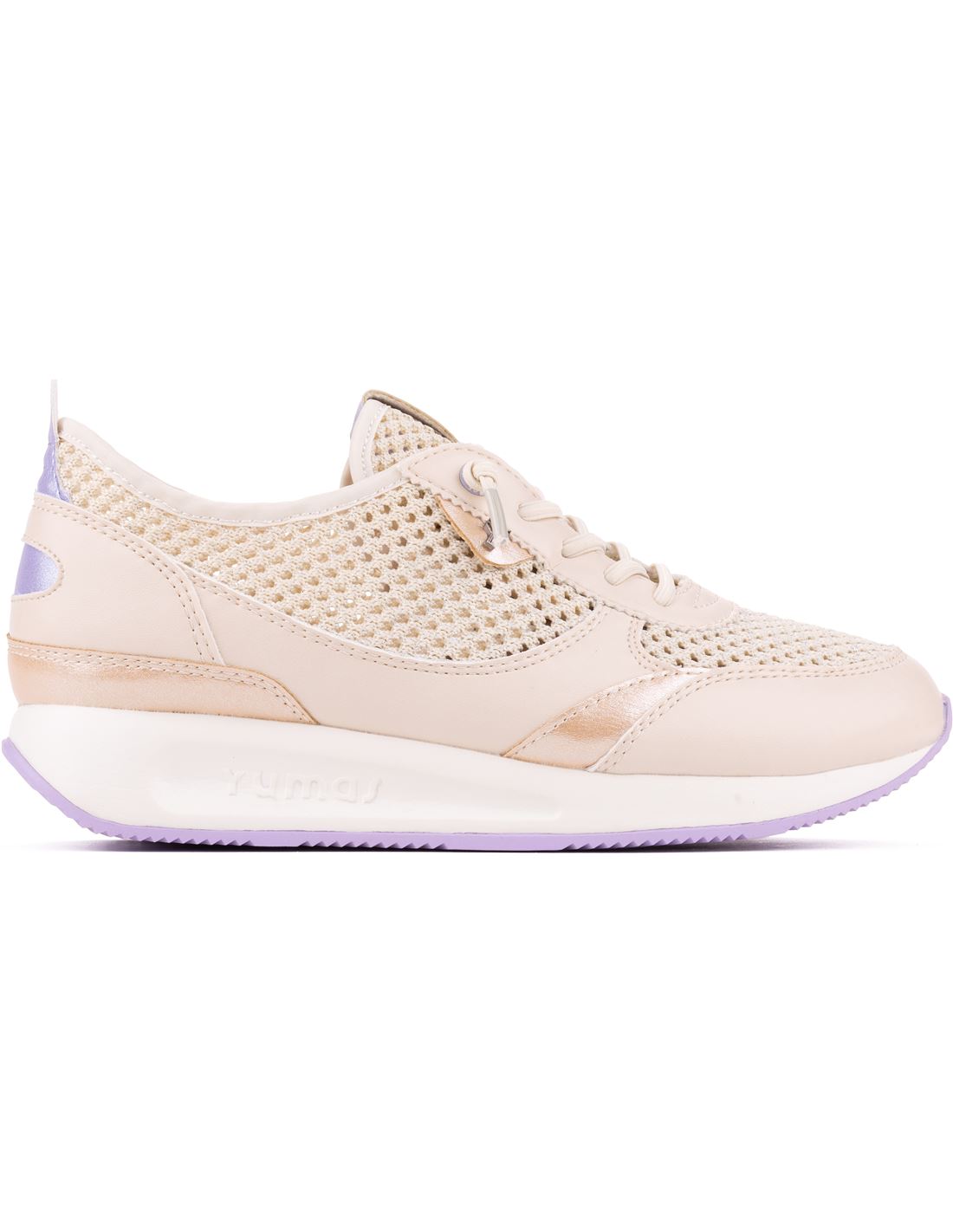 Zapatilla de mujer conelly de Yumas con diseño ligero y transpirable. Malla beige, detalles en dorado rosado y suela lavanda para un look urbano con mucho estilo. ¡Camina con brillo propio!