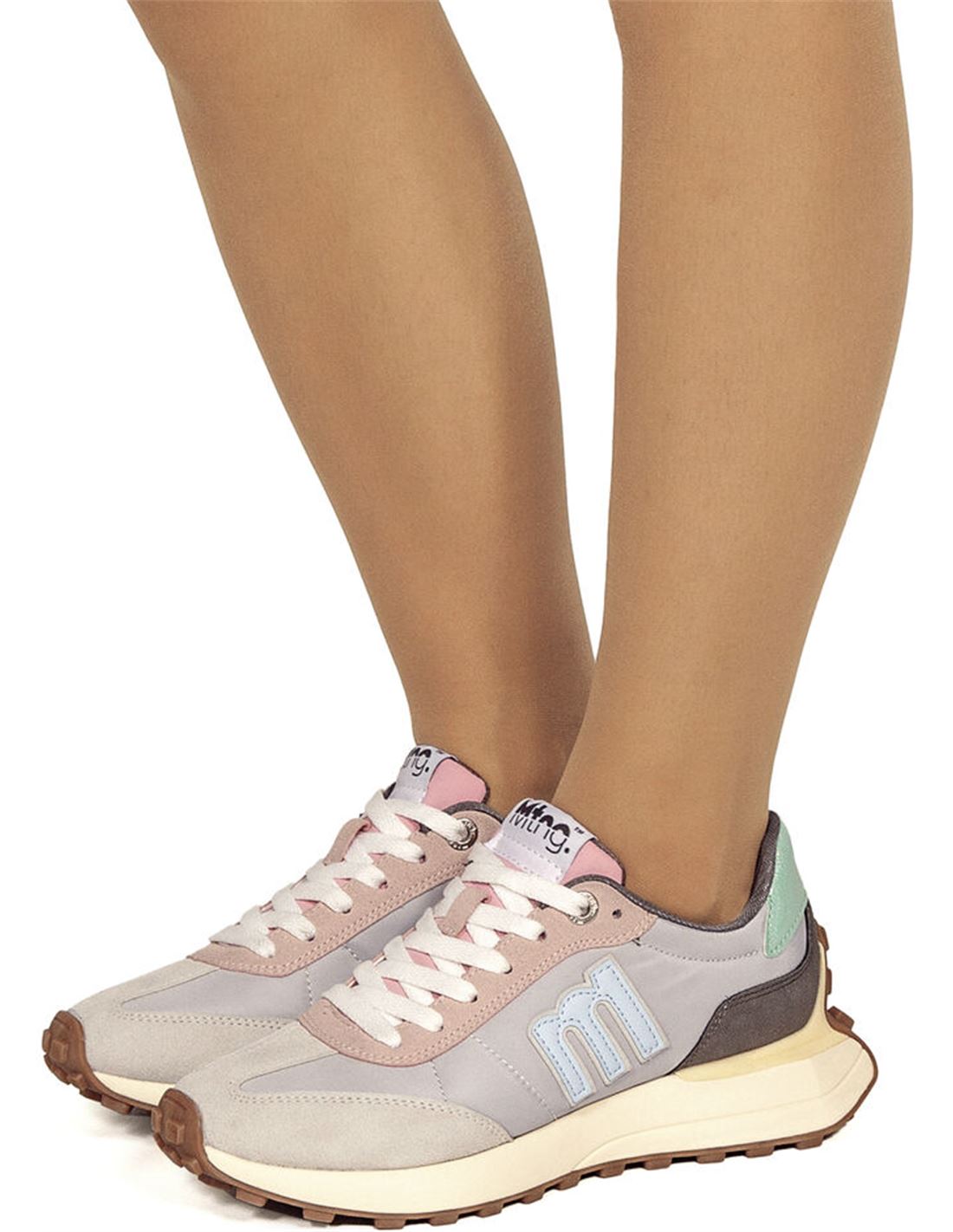 Zapatilla deportiva Zinc Mustang para mujer. Diseñada en varios colores, con detalles en diferentes paneles. Logo de la marca en el lateral. Puntera almendrada. Suela blanca con cubierta marrón dentada. Cierre con cordones planos.