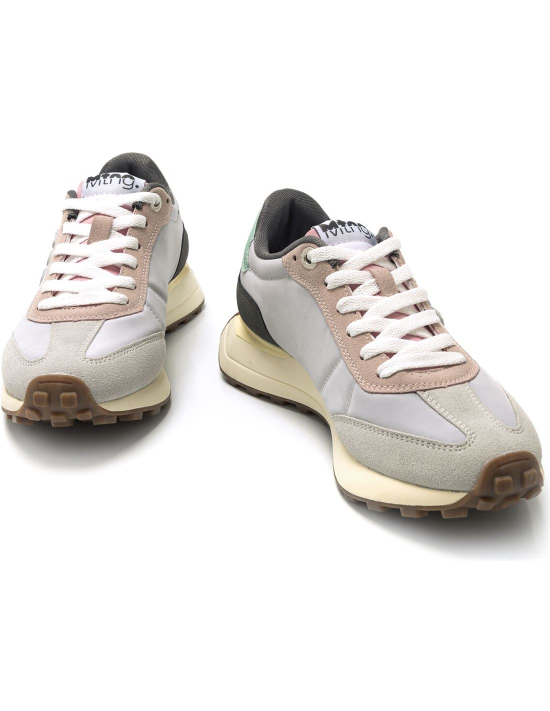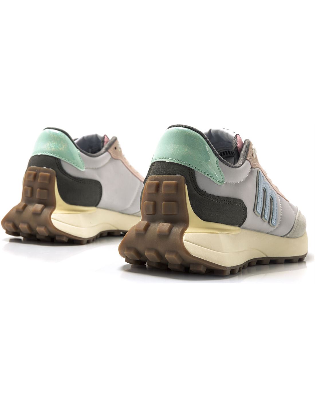 Zapatilla deportiva Zinc Mustang para mujer. Diseñada en varios colores, con detalles en diferentes paneles. Logo de la marca en el lateral. Puntera almendrada. Suela blanca con cubierta marrón dentada. Cierre con cordones planos.
