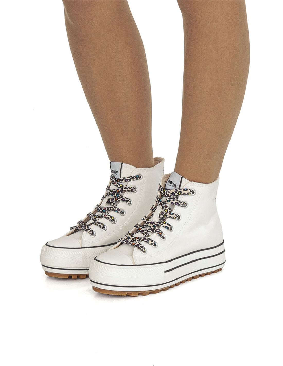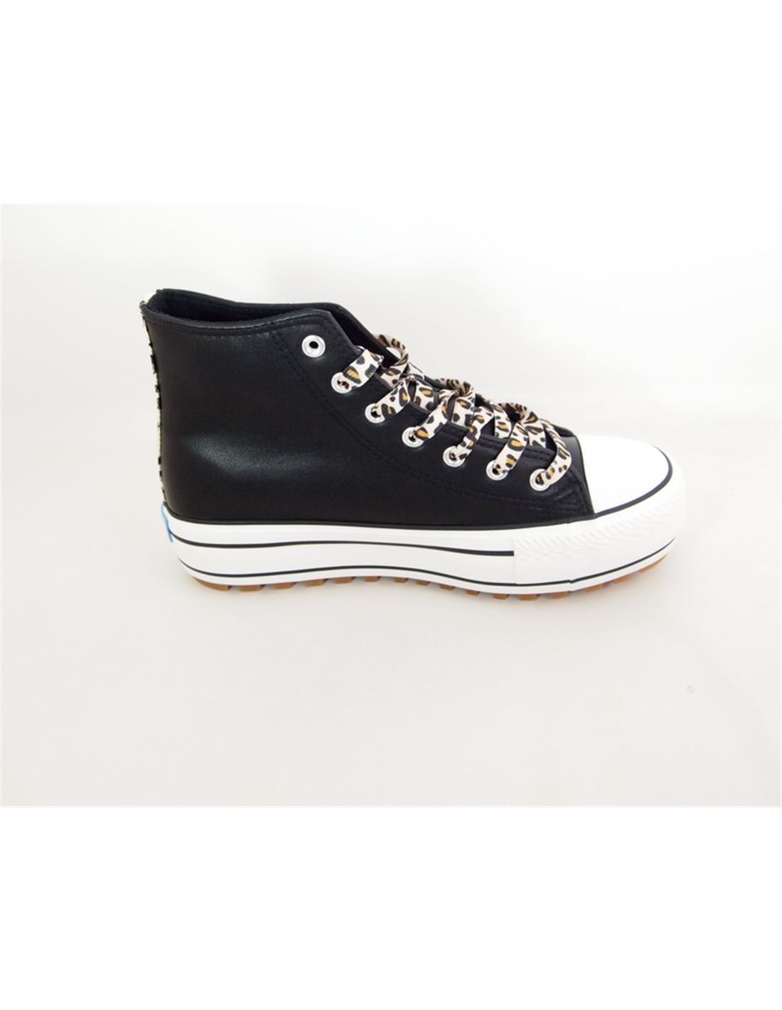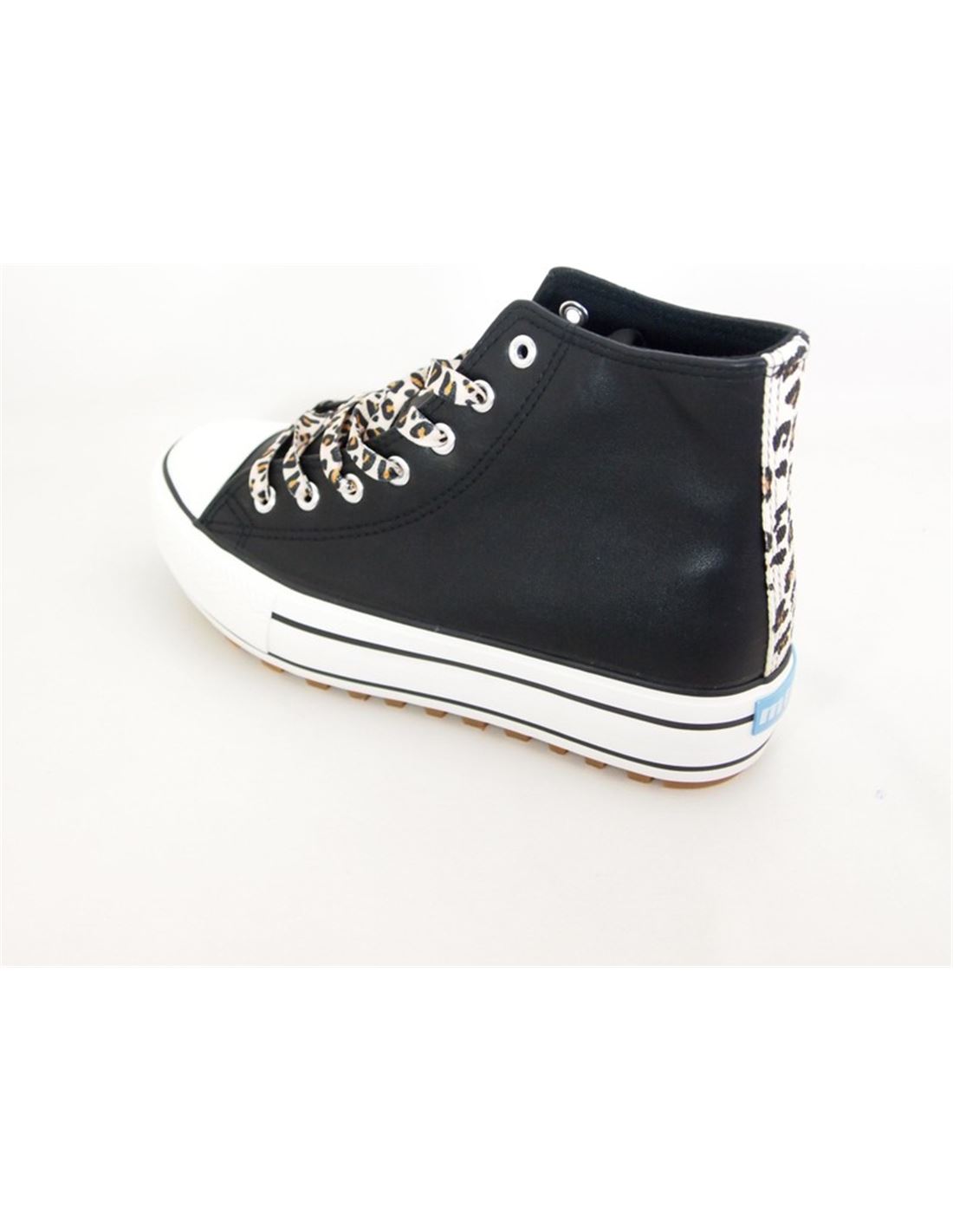 Zapatilla deportiva abotinada Bigger T para mujer diseñada en piel sintética o loneta con suela gruesa y puntera de goma con detalle del perfilado y cierre de cordones en estampado animal print combinada con tira del mismo estampado en la trasera.