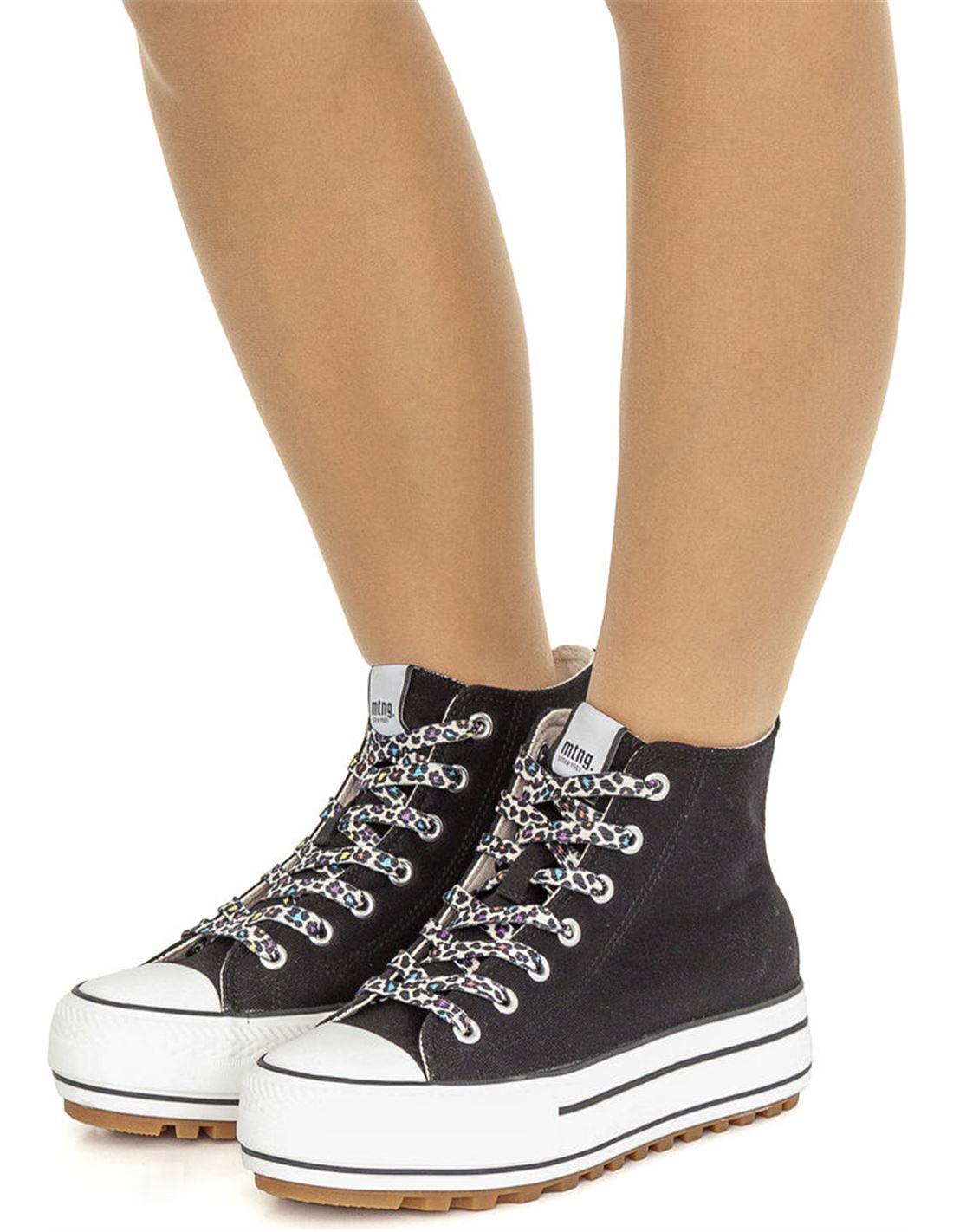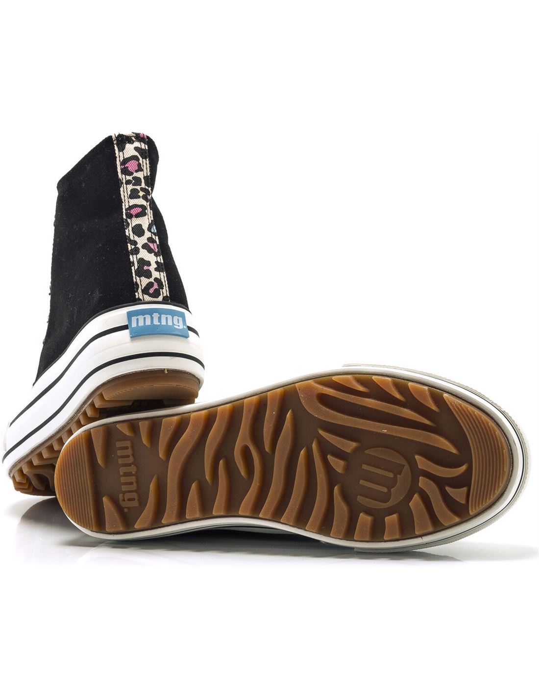 Zapatilla deportiva abotinada Bigger T para mujer diseñada en piel sintética o loneta con suela gruesa y puntera de goma con detalle del perfilado y cierre de cordones en estampado animal print combinada con tira del mismo estampado en la trasera.