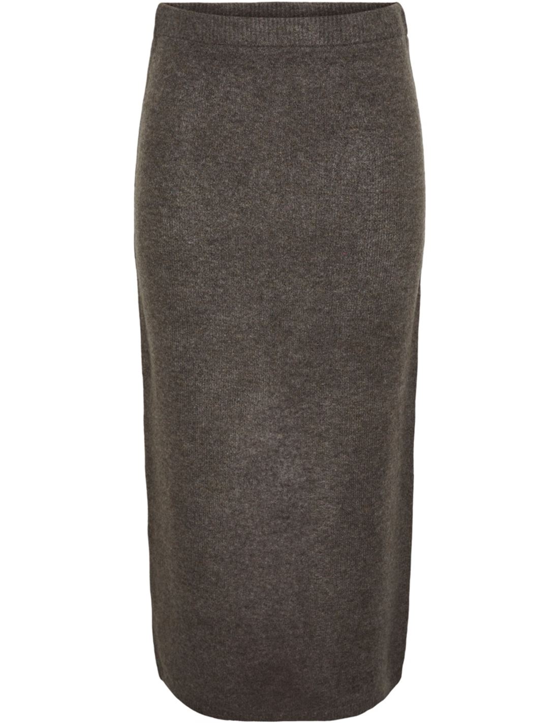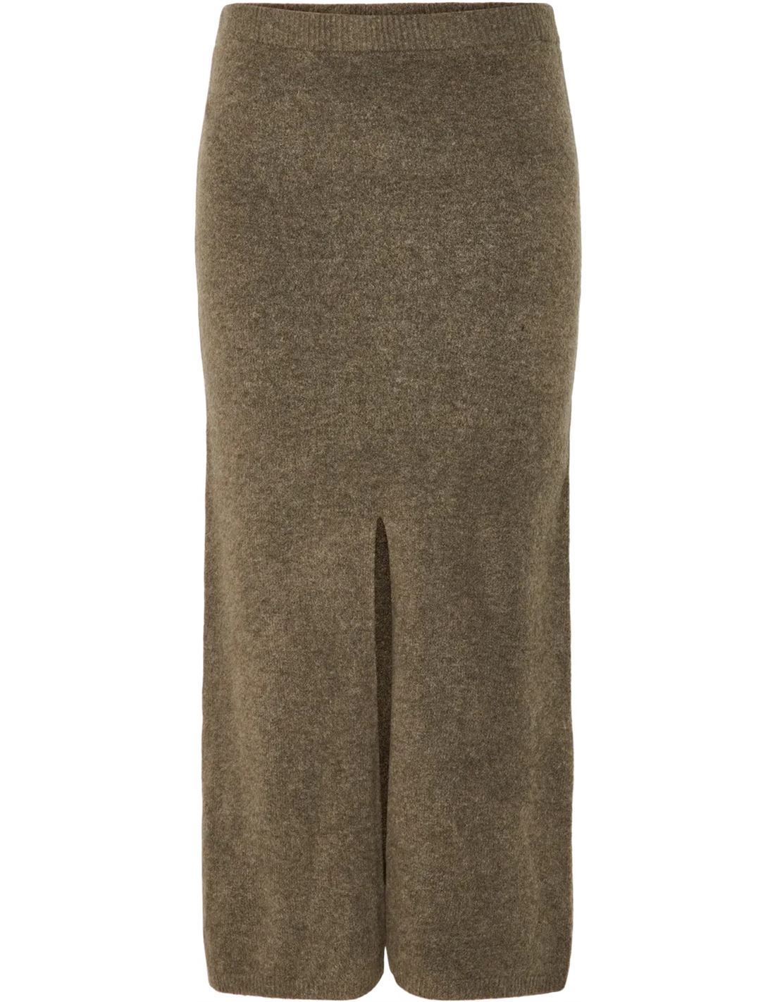 Falda de punto de cintura media y con largo hasta el tobillo. Cintura elástica. Abertura trasera