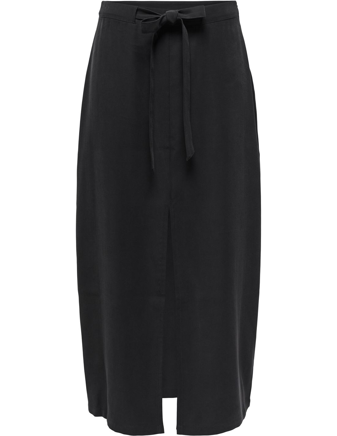 Falda midi tejido sarga con abertura delantera. Cintura con lazada.