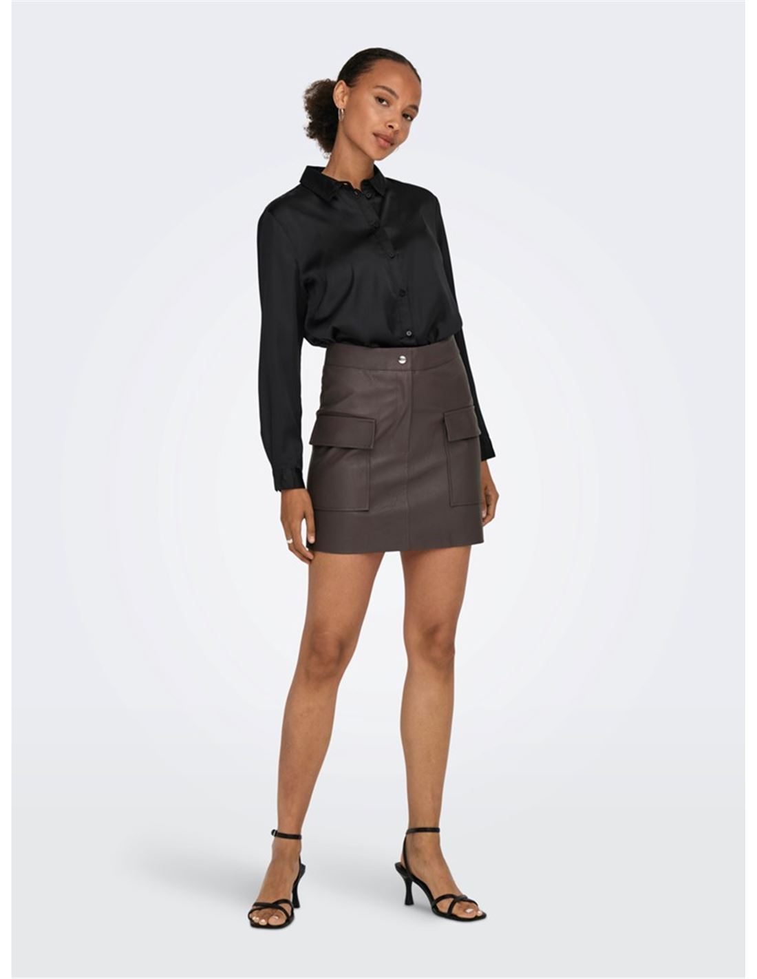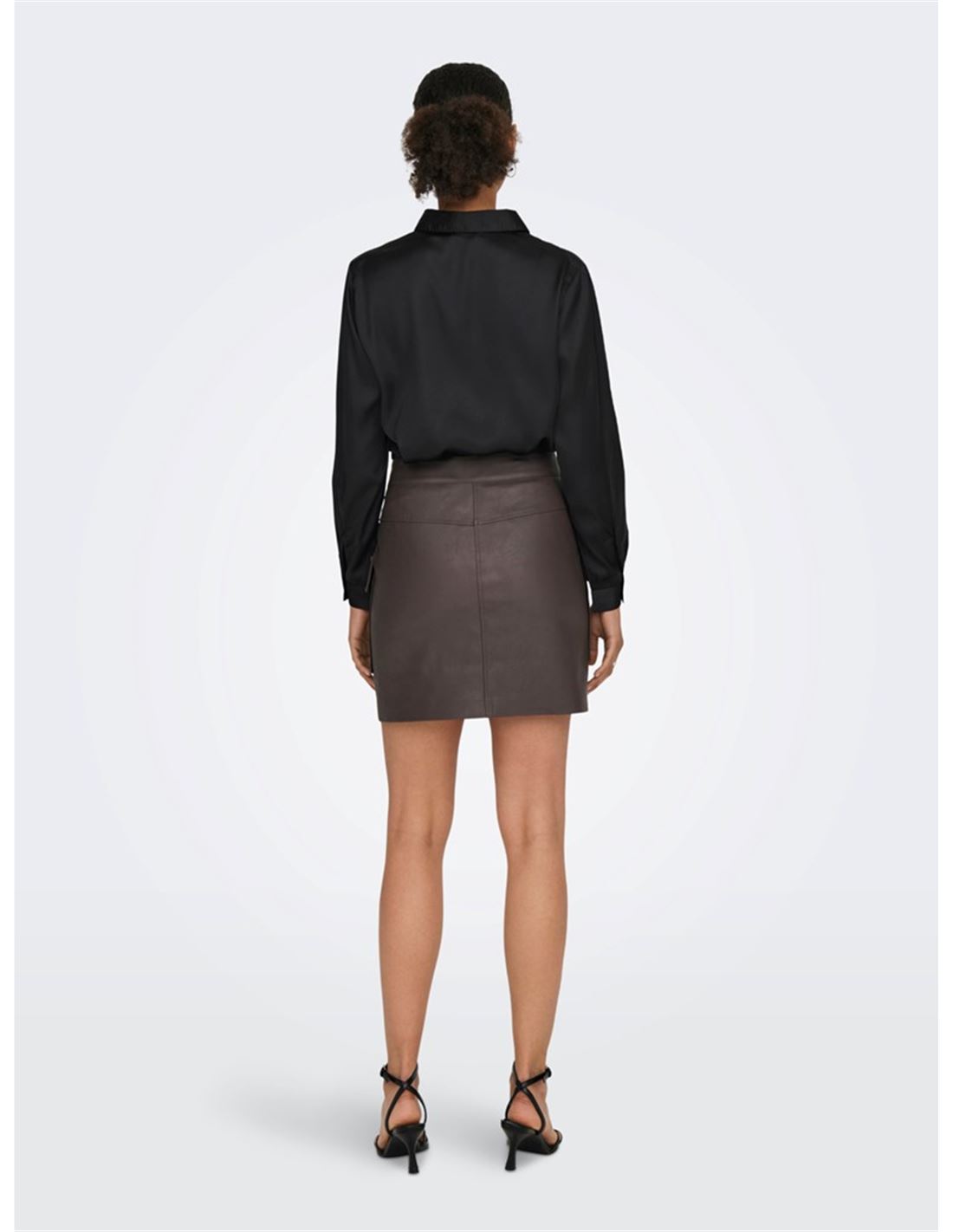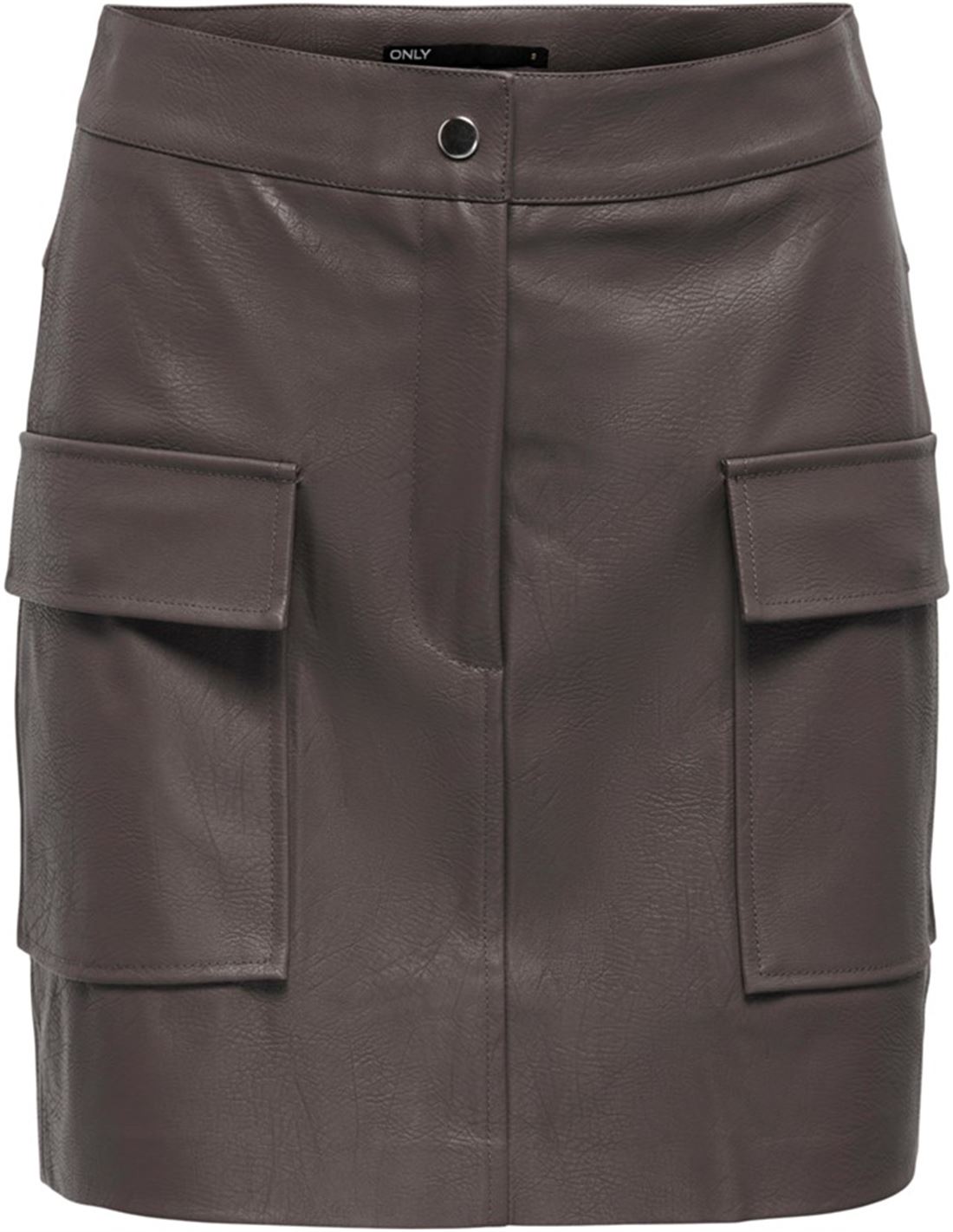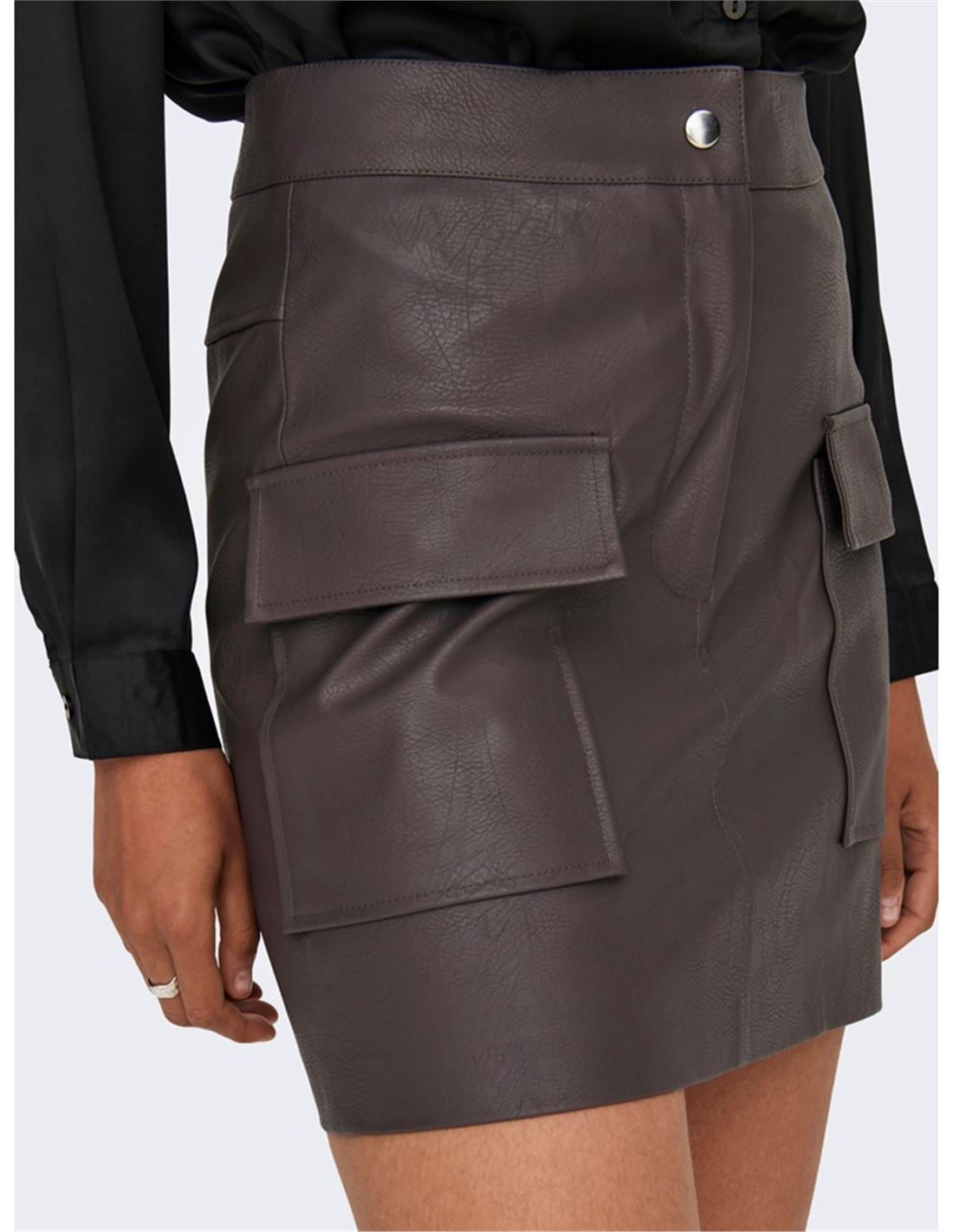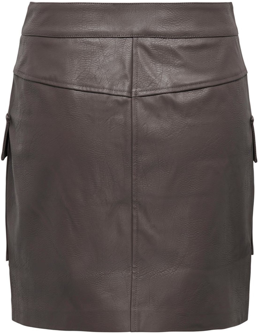 Falda mini de piel sintética. Detalle de bolsillos en el delantero.