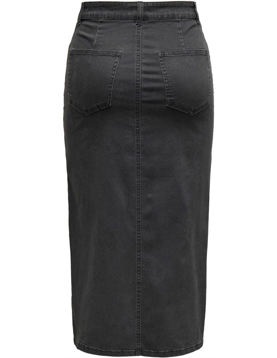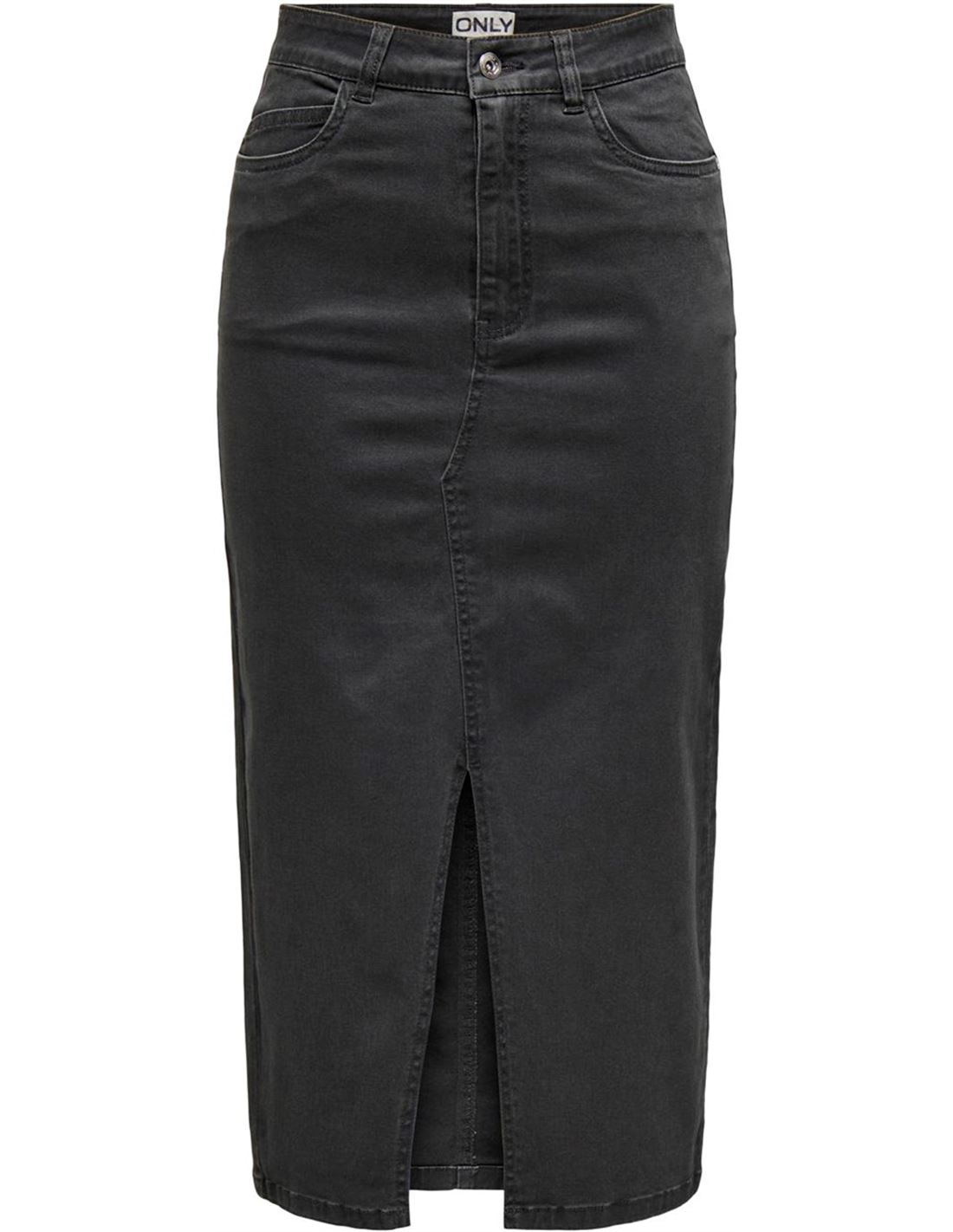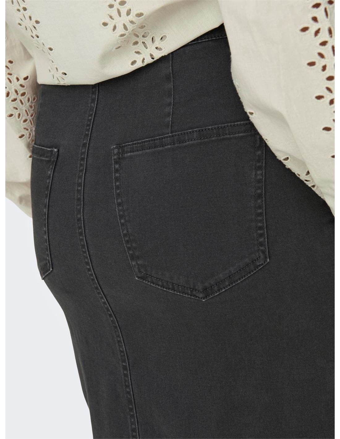 Falda largo midi con cintura alta. Bolsillos delanteros y traseros. Trabillas para el cinturón. Abertura delantera.
