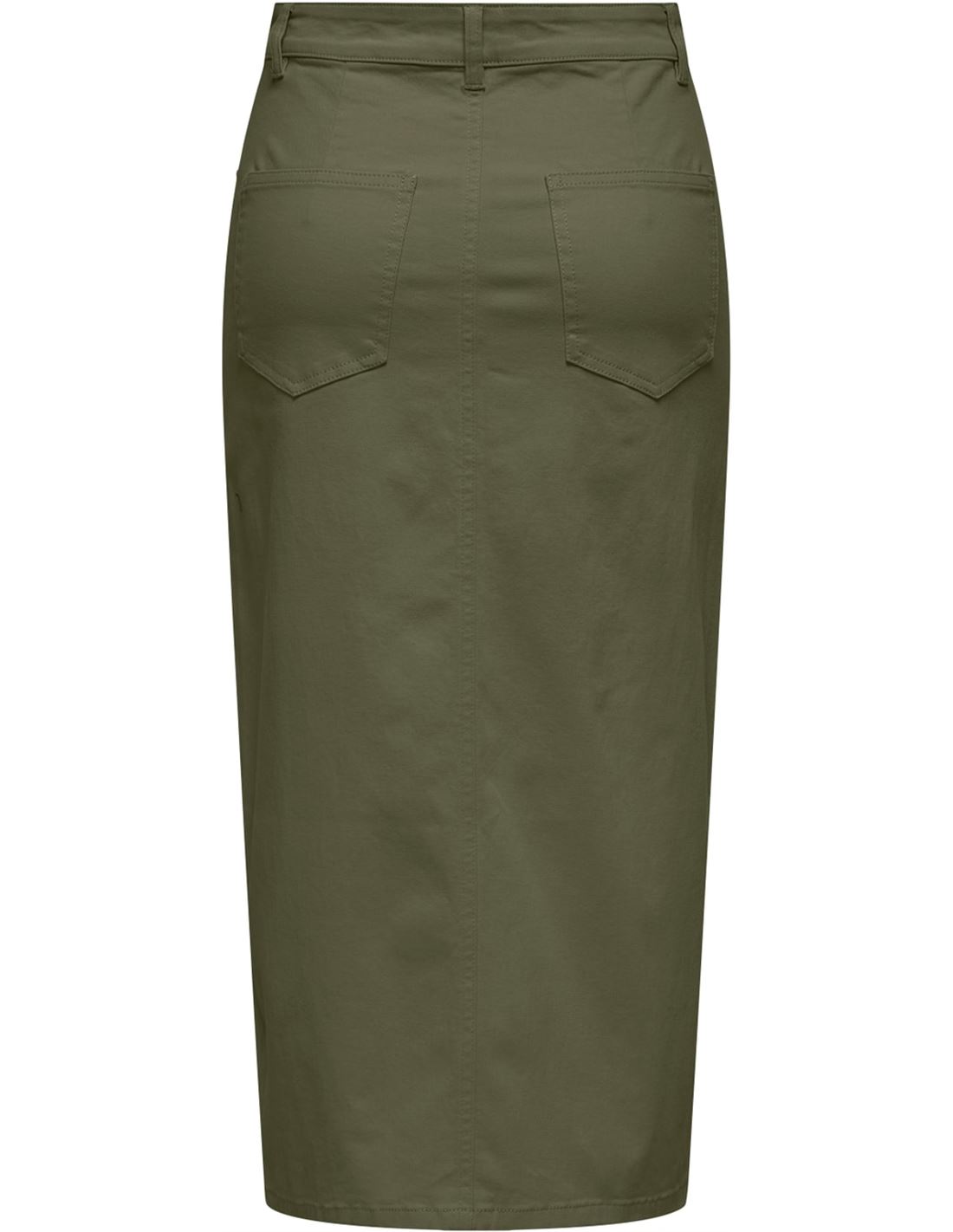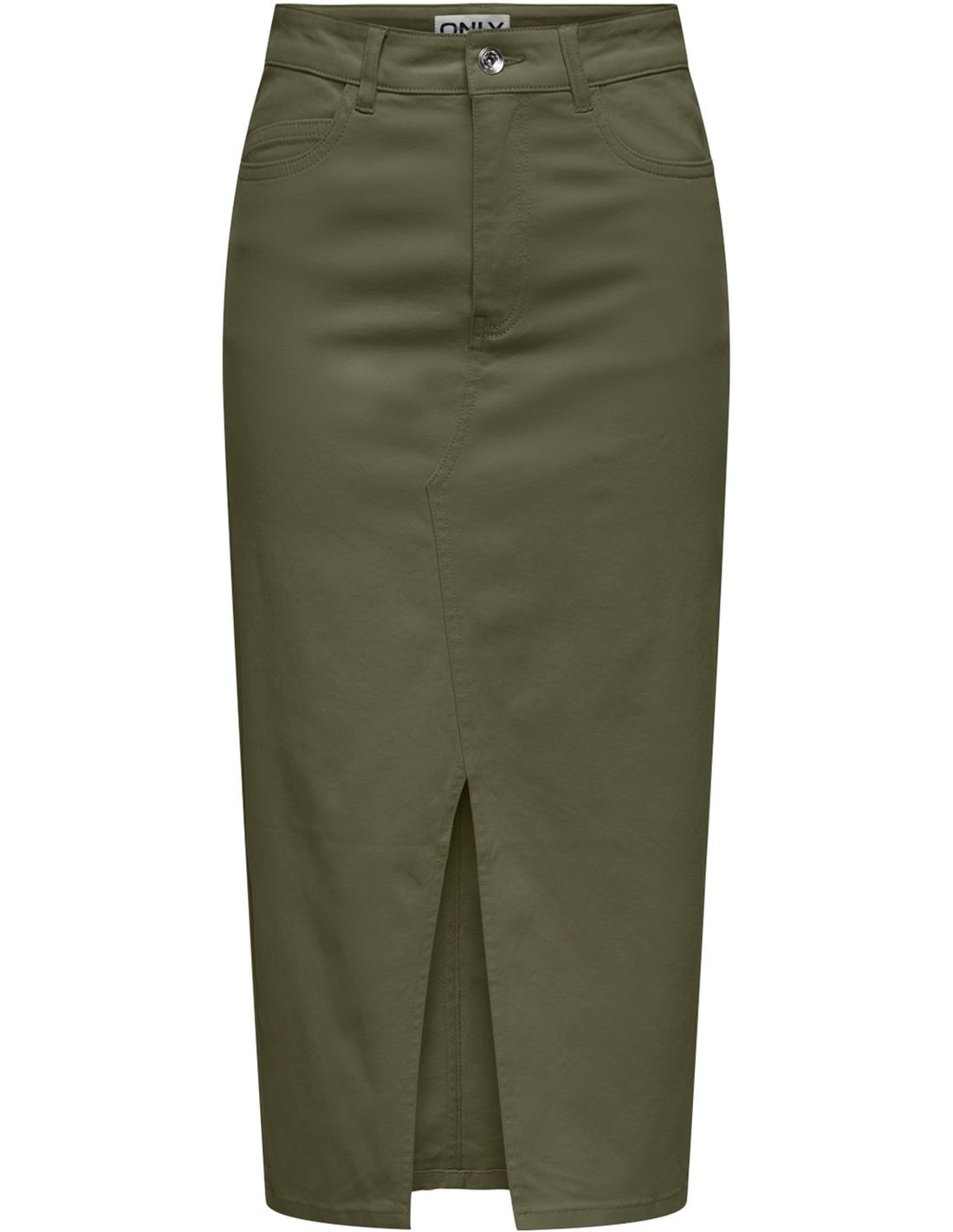 Falda largo midi con cintura alta. Bolsillos delanteros y traseros. Trabillas para el cinturón. Abertura delantera.