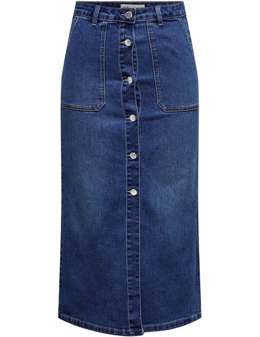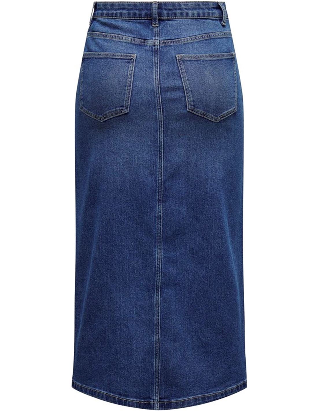 Falda midi denim con bolsillos de plastrón en delantero y trasero. Cierre con botones y abertura delantera.