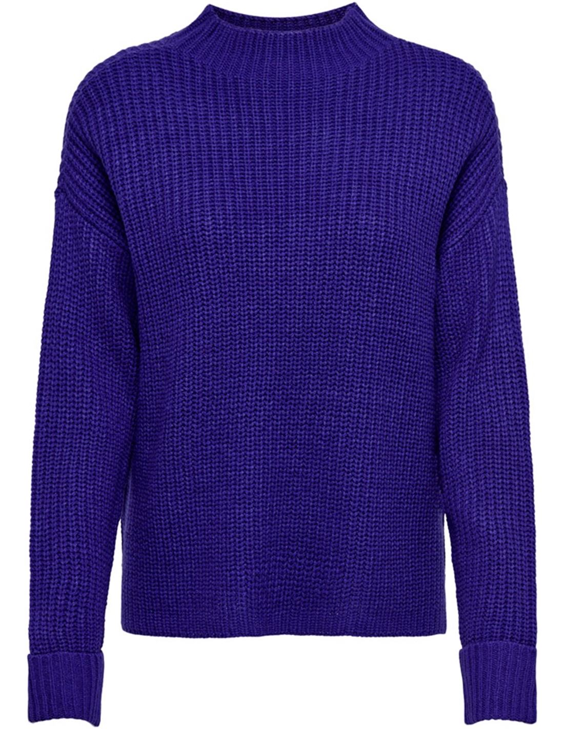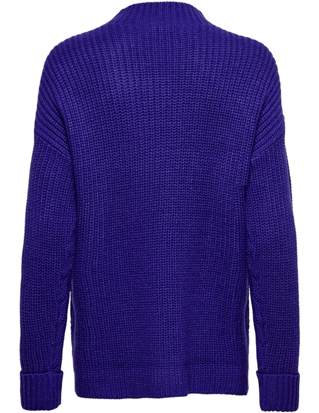 Jersey de mujer con cuello subido. Mangas largas vueltas. Bajo asimétrico, siendo la parte trasera más larga.